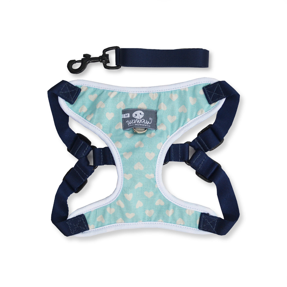 Pechera celeste corazones blancos + traílla